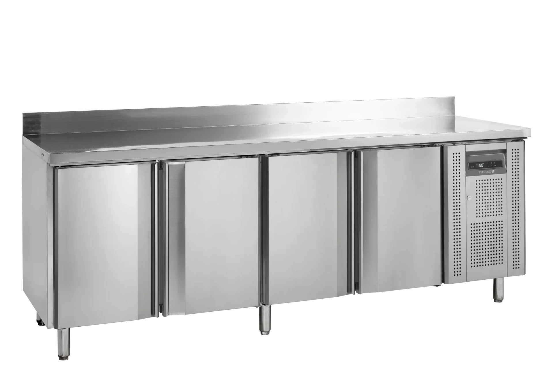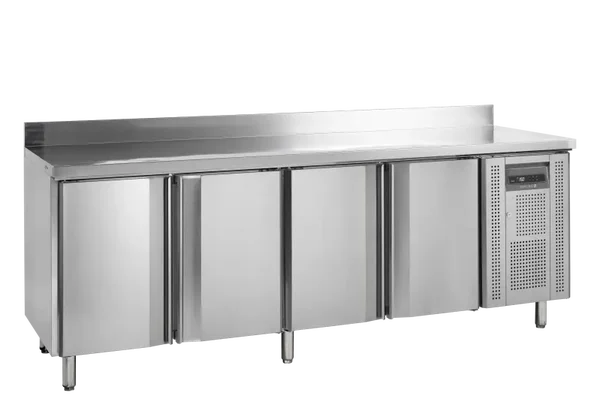 Kylbänk i högkvalitativt rostfritt stål (SS304) med fyra självstängande dörrar och ventilerad kylning som säkerställer jämn temperatur i hela skåpet. Utrustad med elektronisk termostat, automatisk avfrostning och tydlig digital temperaturvisning.